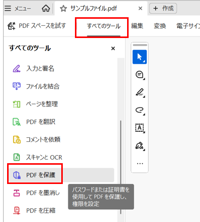 1)Adobe Acrobatを起動し、「すべてのツール」>「PDFを保護」を押下する