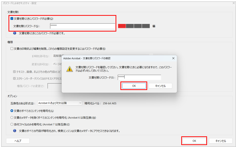 3)「文書を開くときに…」のチェックをONにし、「文書を開くパスワード」を入力>「OK」押下>確認画面で再度入力し「OK」押下する
