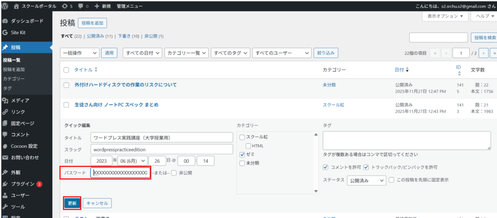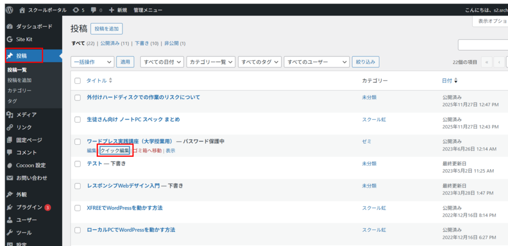 1)WordPressのダッシュボード開き>投稿>パスワードを設定したい投稿の「クイック編集」を押下